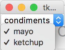 donde la variable var se ha de asociar a una variable de tipo tkinter.BooleanVar(), y su valor (True o False) determinará si aparece o no la marca de selección junto a la etiqueta del ítem. Al hacer clic en esta opción, la variable asociada cambia su estado (si era True pasa a ser False y viceversa).